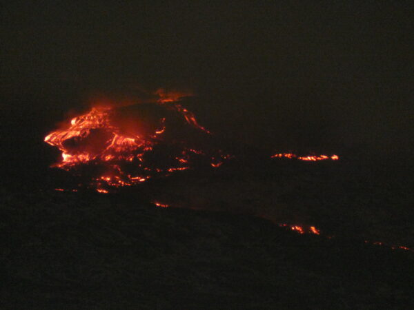 Der Anblick ist spektakulär, denn vom Tal aus sieht es so aus, als würde die Lava die Dörfer am Fuße des Berges gleich verschlingen – doch das ist eine optische Täuschung. Der aus dem Riss schießende Lavastrom ist weit von den Ortschaften entfernt, liegt aber deutlich niedriger als die Gipfelkrater. Mit bloßem Auge ist bei klarem Himmel ein deutlicher Riss mit sprudelnder Lava und ein gewaltiger Lavastrom zu erkennen, der einen steilen Hang in nordöstlicher Richtung hinabfließt.